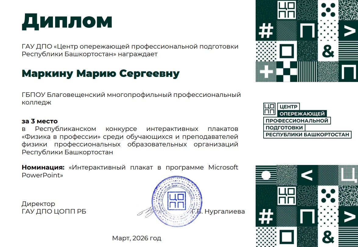 Преподаватель физики Маркина Мария Сергеевна заняла ⭐️третье место⭐️ в Республиканском конкурсе интерактивных плакатов среди преподавателей профессиональных образовательных учреждений Республики Башкортостан.